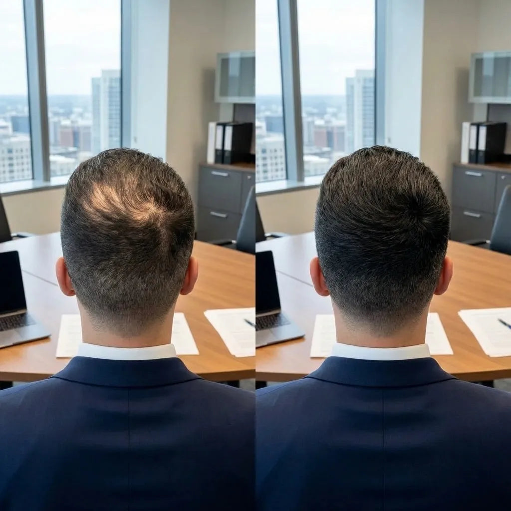 Ja — Kerablend kan påføres direkte på glatte eller skaldede områder. Formlen er udviklet til at binde sig til både hud og hår, hvilket skaber en naturlig dækning, der smelter sammen med din hårfarve. For at opnå det bedste resultat skal du påføre produktet let og gradvist opbygge dækningen, især når du blander det med det omgivende hår.